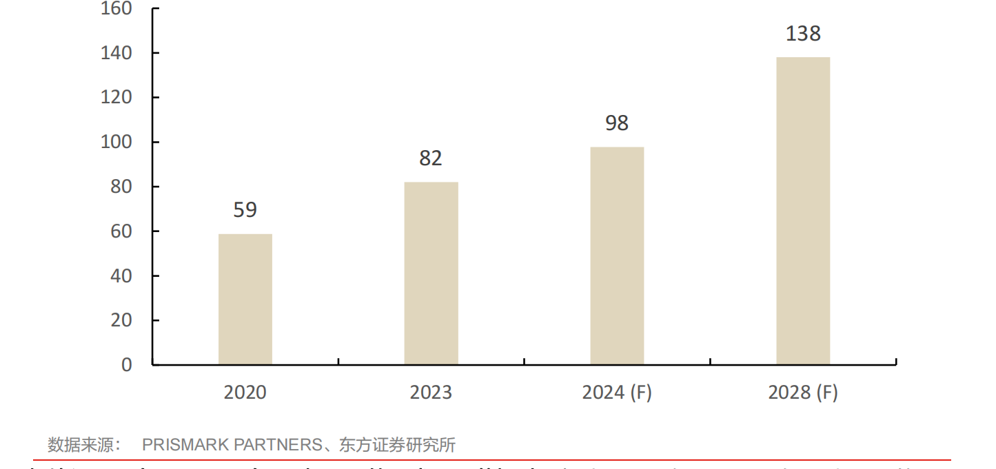 图表6:2020-2028年全球PCB行业服务器/数据存储领域市场规模(亿美元)