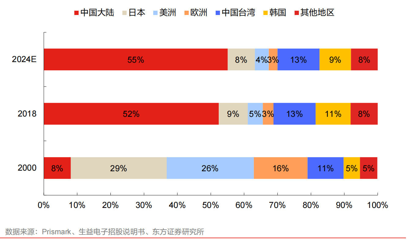 A)全球PCB市场稳定增长,中国核心地位稳固。根据Prismark预测,到2027年全球PCB市场规模将增至984亿美元,8年CAGR达6%。根据中商产业研究院报告显示,2019-2024年中国PCB市场规模将由2267亿元增至3469亿元,5年CAGR达9%。PCB行业市场集中度较低,全球PCB产能向亚太地区转移,中国成为全球第一大PCB生产国,中国大陆PCB产能集中于中低端领域,端应用催动PCB产品结构升级,行业有望向集中化方向演进,我国PCB厂商产品逐步向高端化迈进。