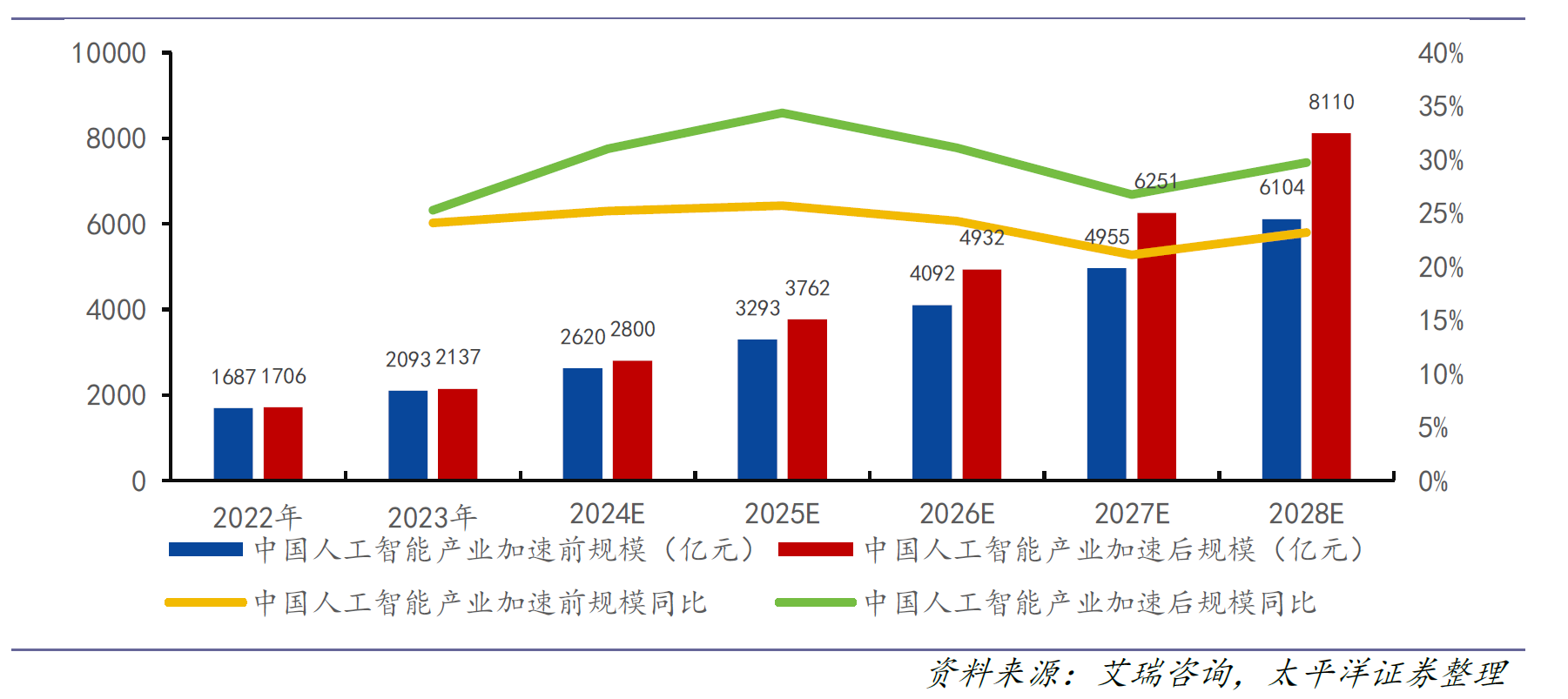 图表1:2028年中国人工智能产业规模预计8110亿元(2023-2028年CAGR 30.6%)