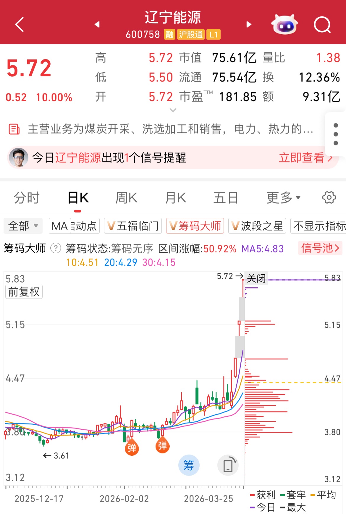 注:主升浪有无可寻之迹象?来看这个案例:辽宁能源早在2月就出现了“弹”信号,并逐渐演化成主升浪!还有什么股出现了相关信号?还有更多案例参考学习吗?尽在“筹码大师”!点击查看>>