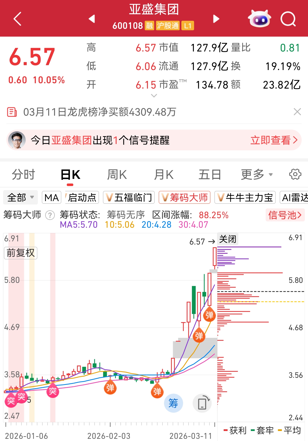 注:主升浪并非无迹可寻!!“筹码大师”显示,亚盛集团早在2026年1月份就密集出现了“突”信号,2月24日出现“弹”信号,随后启动了一波延续至今的主升浪!