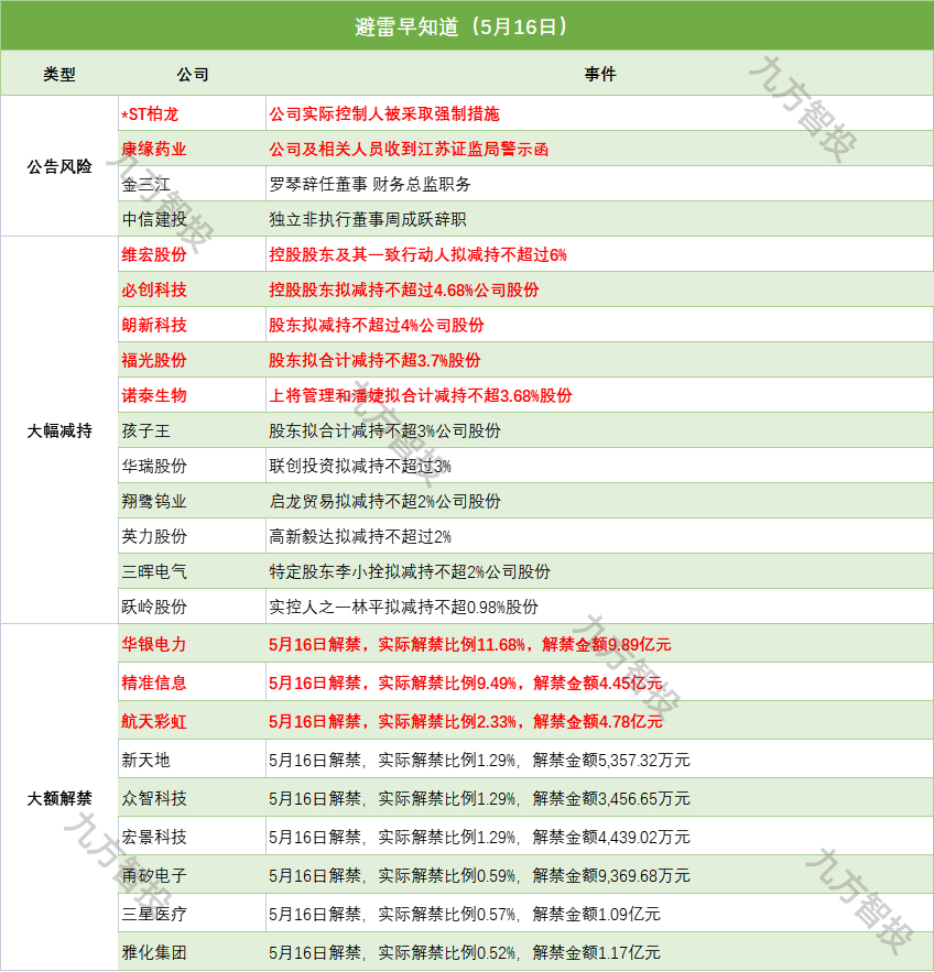 3)华银电力:5月16日解禁,实际解禁比例11.68%,解禁金额9.89亿元