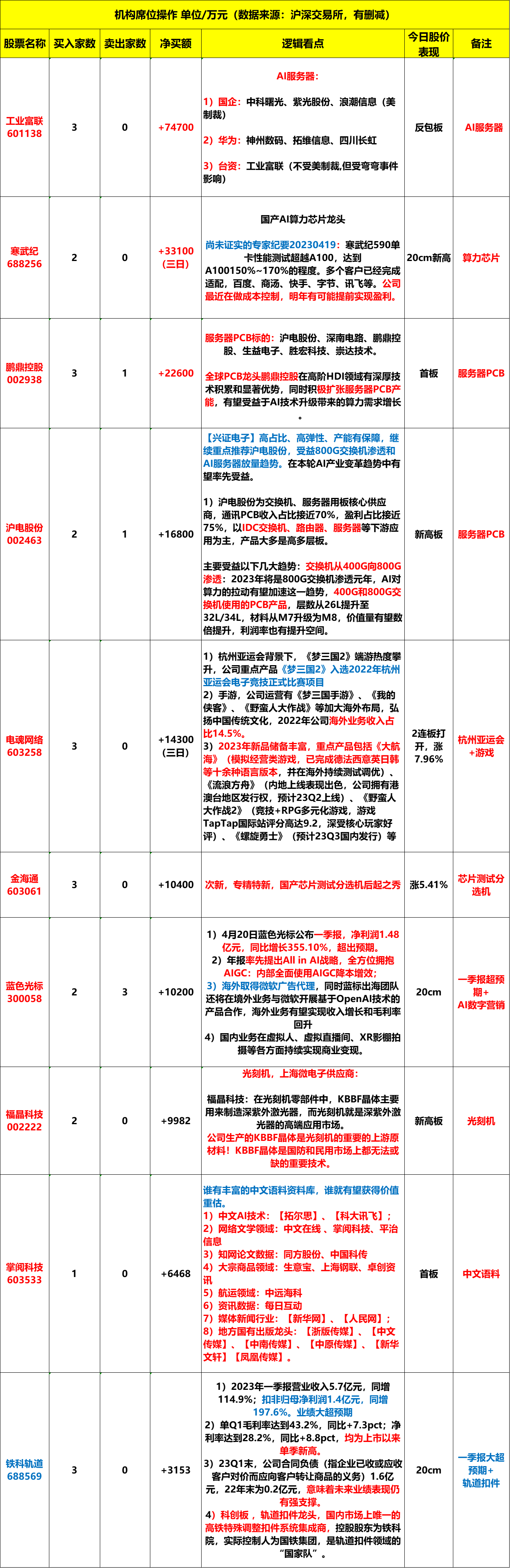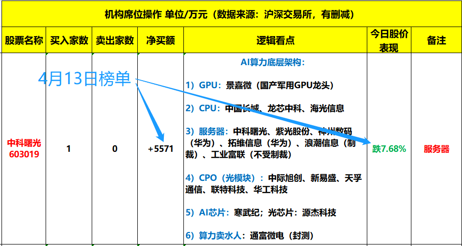 我们对中科曙光的首次异动扑捉,是在4月13日的龙虎榜单,下图所示: