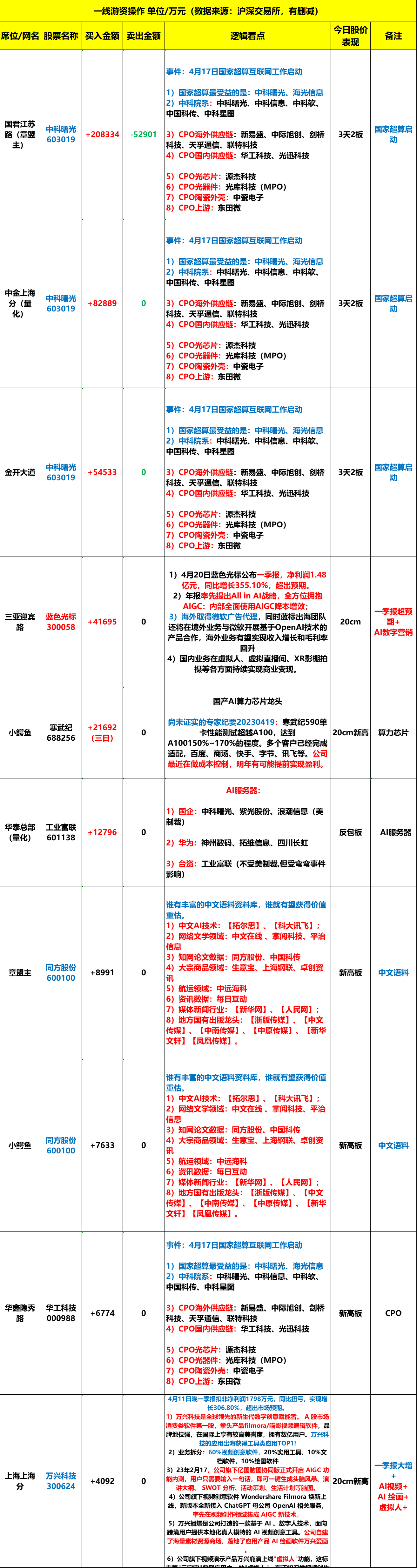 今天的龙虎榜榜单 很豪华、很震撼、很疯狂,中科曙光被一线游资大佬暴买20亿元,打破历史上榜买入金额最高纪录。