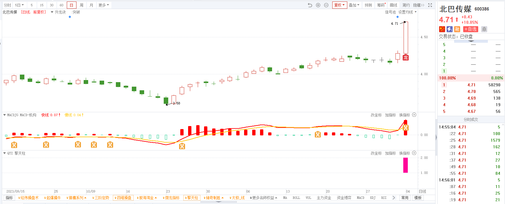 3)参考技术指标:北巴传媒-升龙诀指标-出现龙信号