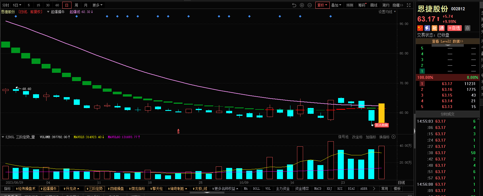 3)参考技术指标:恩捷股份-起爆擒牛指标-出现巨人抬肩信号