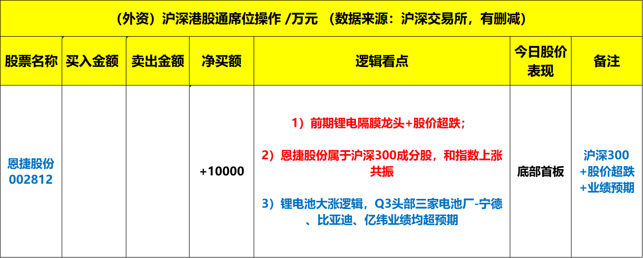 1)核心逻辑:前期锂电隔膜龙头+股价超跌;恩捷股份属于沪深300成分股,和指数上涨共振。近期锂电池大涨逻辑,Q3头部三家电池厂-宁德、比亚迪、亿纬业绩均超预期。