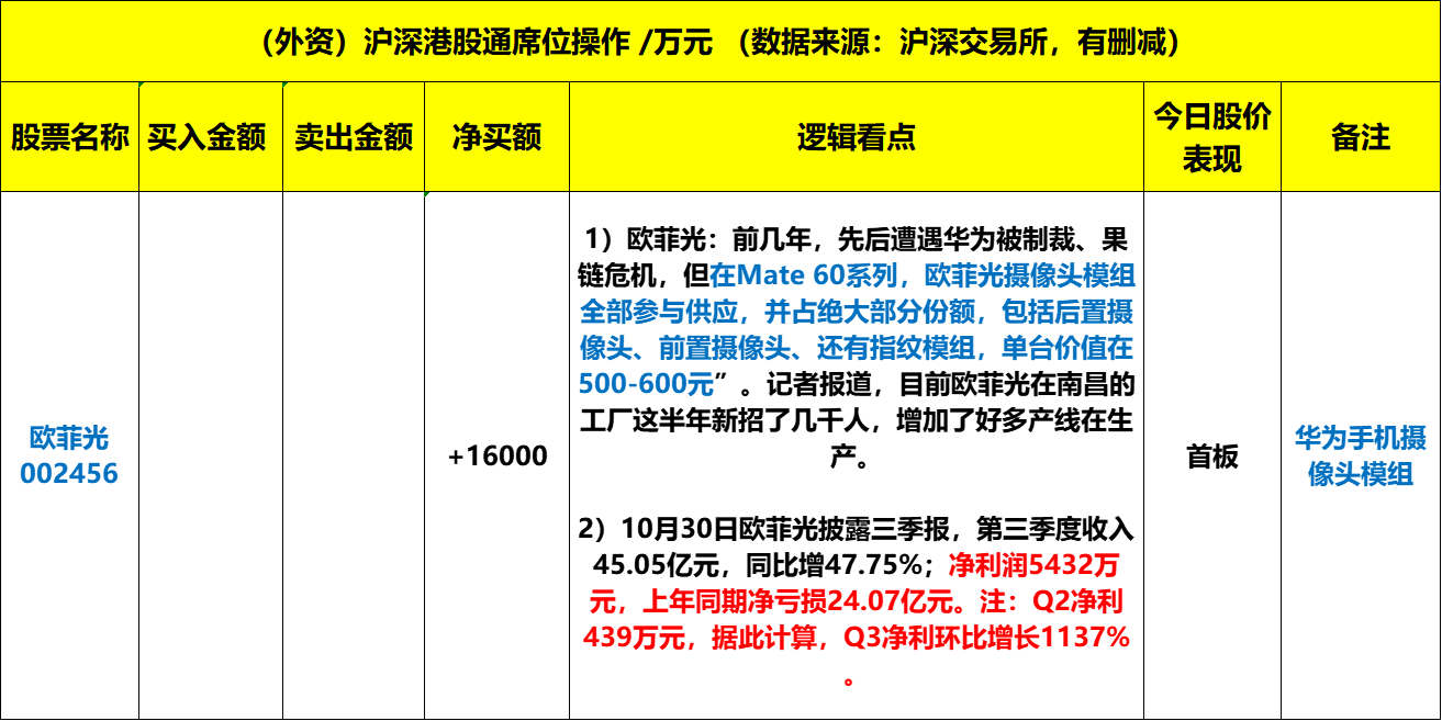 1)核心逻辑:华为全面归来,救活欧菲光。10月30日欧菲光披露三季报,第三季度收入45.05亿元,同比增47.75%;净利润5432万元,上年同期净亏损24.07亿元。注:Q2净利439万元,据此计算,Q3净利环比增长1137%。