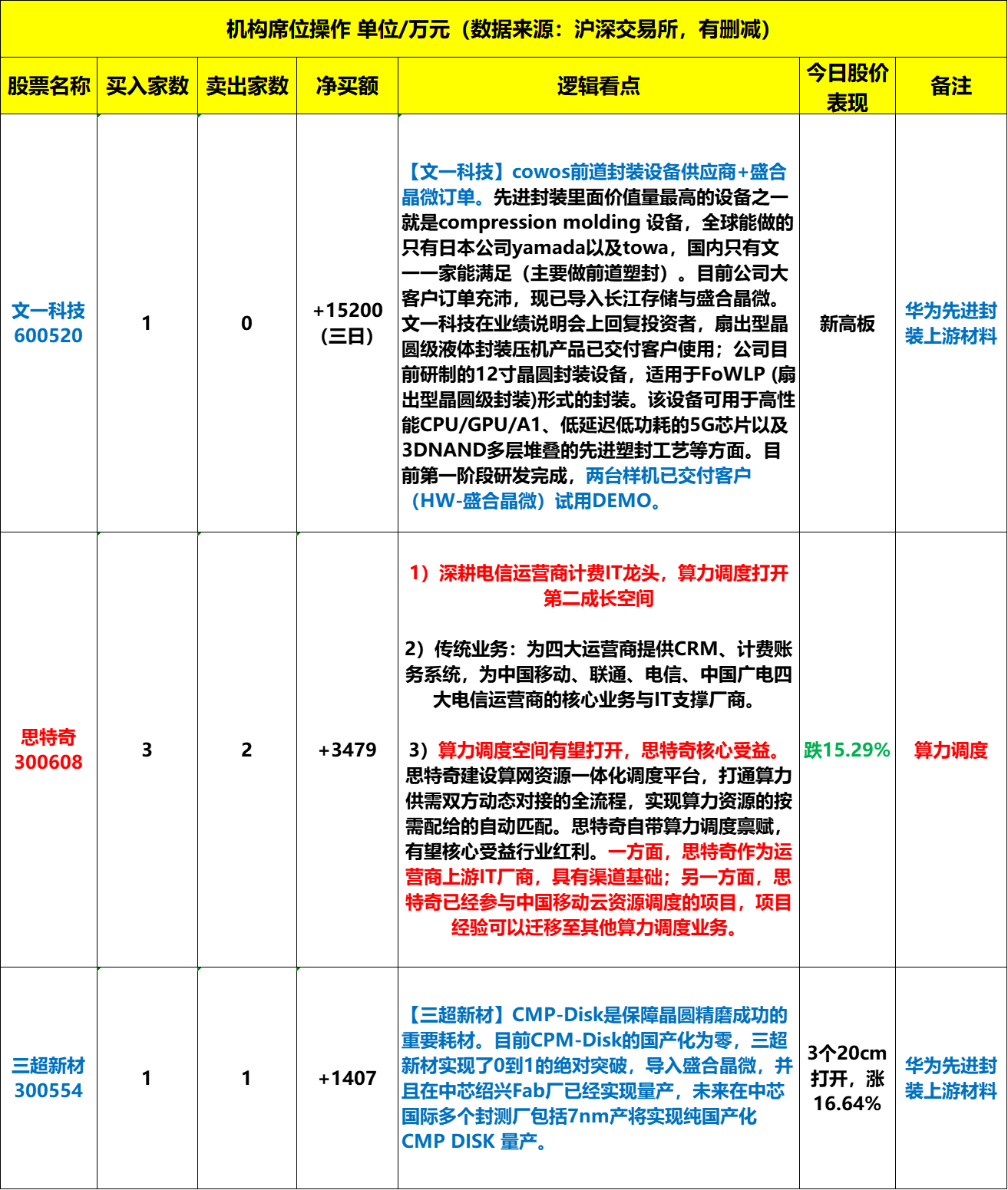 1)【文一科技】:cowos前道封装设备供应商+盛合晶微订单。国内只有文一一家能满足(主要做前道塑封)。目前公司大客户订单充沛,现已导入长江存储与盛合晶微。