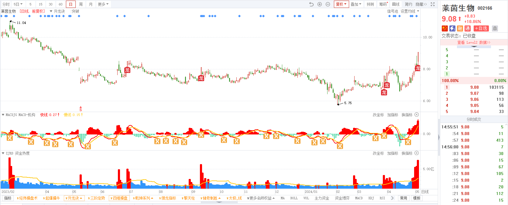3)参考技术指标:莱茵生物-升龙诀指标-出现龙信号