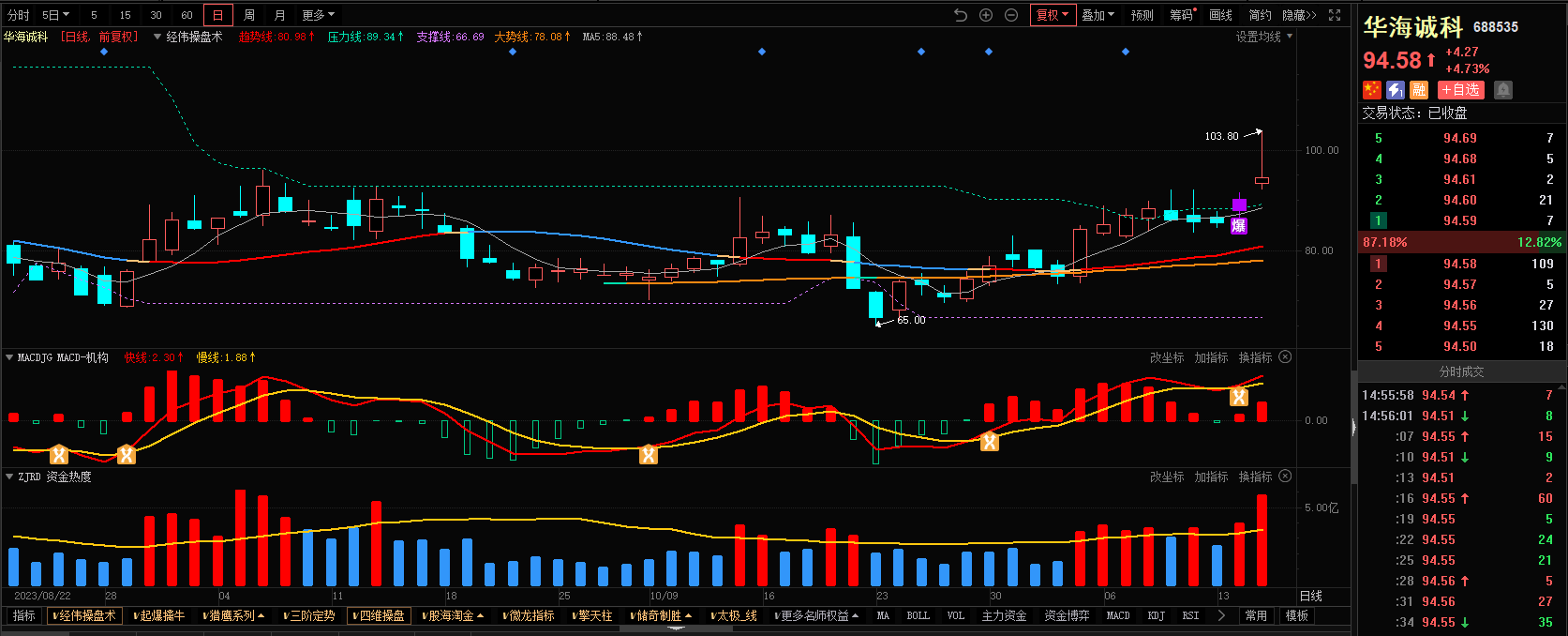 3)参考技术指标:华海诚科-经伟操盘术指标-出现爆点信号。