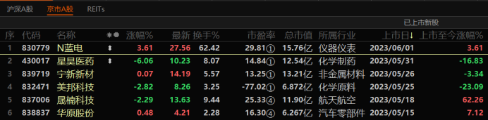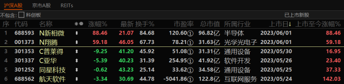 讯(编辑 梓隆),今日(6月1日),新股市场表现活跃,截至收盘,N新相微(新相微)、N翔腾(翔腾新材)分别首日大涨近88.46%、59.18%,同时,今日登陆北交所的N蓝电(武汉蓝电)也录得近3.61%的单日涨幅,整体来看,新股市场6月实现开门红。