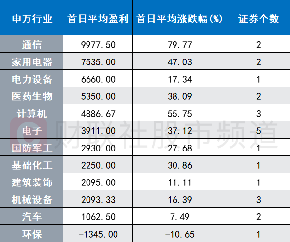 分行业来看,以首日盈利水平统计,5月上市的新股中(不计算北交所),通信板块新股录得最佳“成绩”,两只个股首日平均盈利近9980元,家用电器、电力设备、医药生物、计算机、电子板块新股也表现出色。若按证券板块来统计,创业板新股平均盈利近6000元,科创板、沪主板新股分别平均盈利近3000元、2250元,而深主板新股盈利规模相对较小,近1500元。