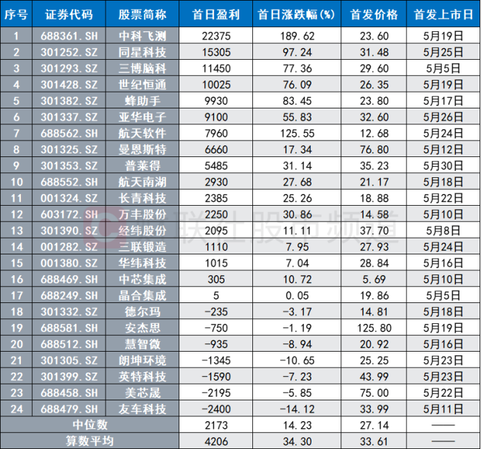 近期,新股市场逐步回暖,以5月上市新股(不计算北交所)统计,24只个股中17只首日成功收涨,整体占比近七成。若均以一签500股计算,5月新股首日打新平均收益近4200元,中位数收益近2170元。其中,中科飞测、同星科技、三博脑科、世纪恒通4股首日盈利均超万元,蜂助手、亚华电子、航天软件、曼恩斯特等股也盈利居前,而友车科技、美芯晟、朗坤环境则表现不佳。