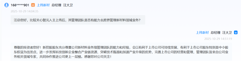 对此,上纬新材总经理汪大卫回应,新控股股东充分尊重公司现有管理团队的能力和经验;管理成员均为业务相关领域专家,将共同推进公司发展。
