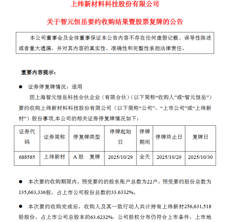 10月29日晚间,上纬新材公告称,上海智元恒岳科技合伙企业(有限合伙)(以下简称智元恒岳)要约收购公司股份期限届满。