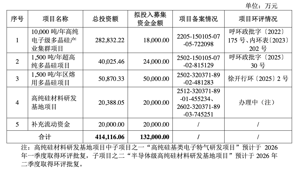招股书显示,鑫华科技拟募资13.2亿元,用于10000吨/年高纯电子级多晶硅产业集群项目、1500吨/年超高纯多晶硅项目、1500吨/年区熔用多晶硅项目、高纯硅材料研发基地项目等建设。