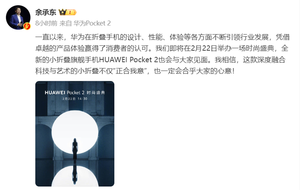除了存储之外,华为终端龙年首场发布会也即将登场。2月22日,华为将举办新品发布会,主题为“Pocket 2时尚盛典”,本次发布会将推出华为新一代小折叠旗舰手机HUAWEI Pocket 2。