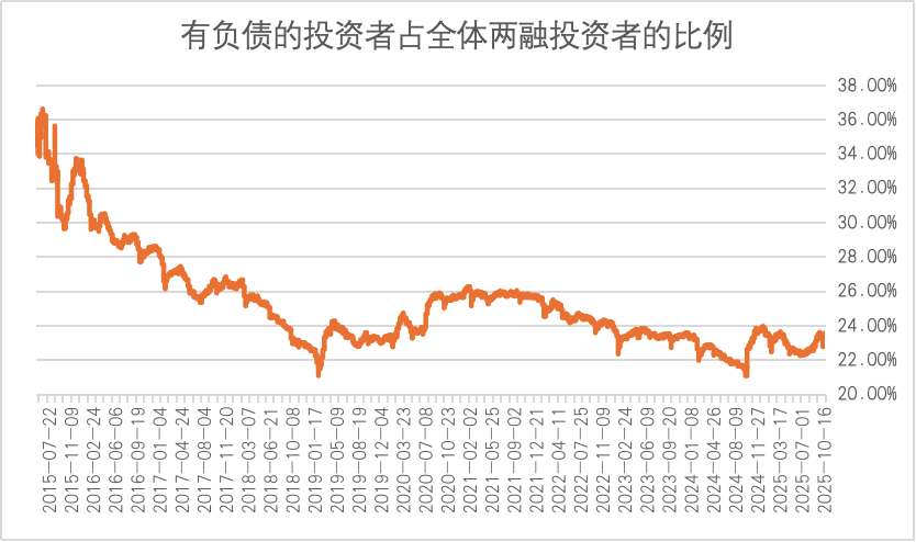 从有负债的投资者占全体融资融券投资者的比例数据来看,截至10月16日,这一比例为23.53%,9月30日,这一比例为22.75%。而在十年前,这一比例最高曾达到36.57%。当前有负债的两融投资者占比同样远低于十年前,差距超过13个百分点。