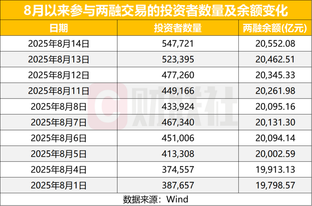 参与融资融券业务的客户显著增多。数据显示,自8月8日起,参与两融的客户数量已连续5个交易日保持增长态势,截至8月14日,已达到54.77万人。
