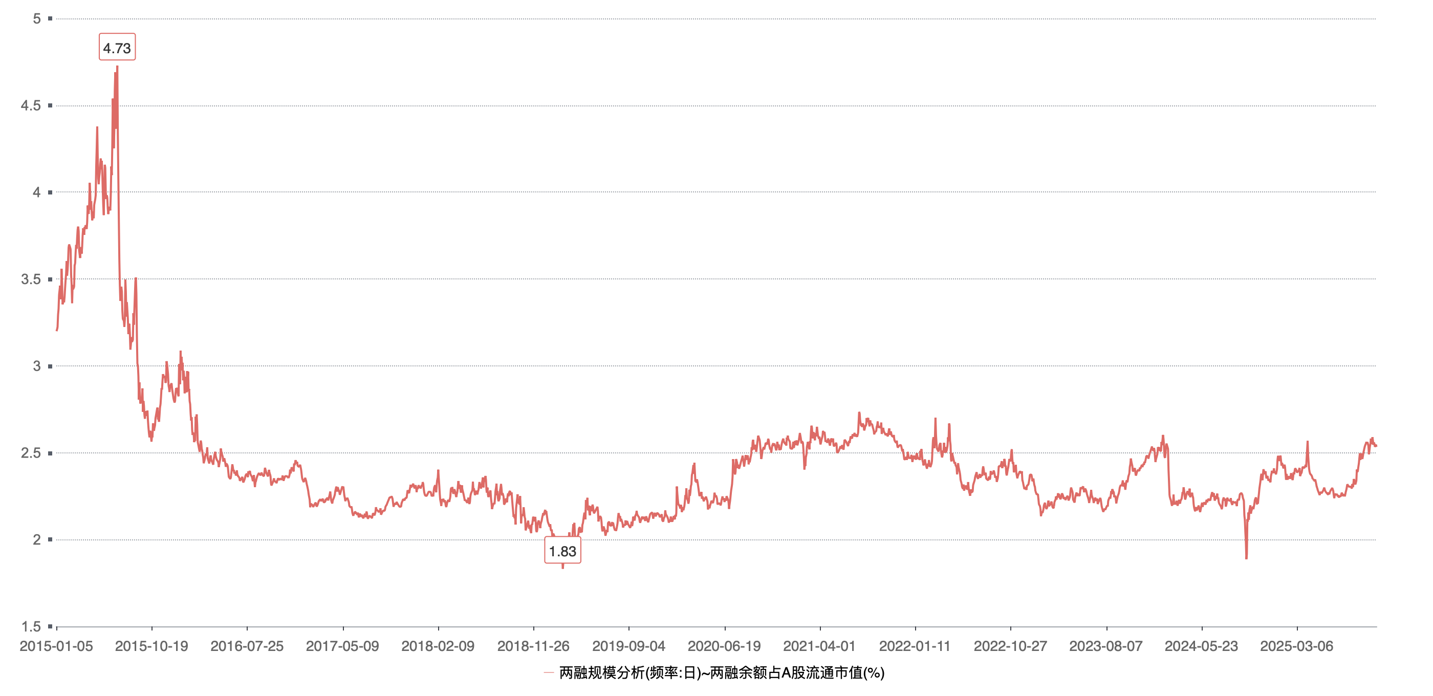 其二,两融余额占流通市值比例仍处低位。最新数据显示,昨日两融余额占A股流通市值的比例为2.53%。回顾历史,这一比例在2015年曾达到4.73%的峰值,此后逐步回落,长期在2.00%-2.50%区间震荡。当前比例不仅低于历史峰值,且处于相对合理的区间内。