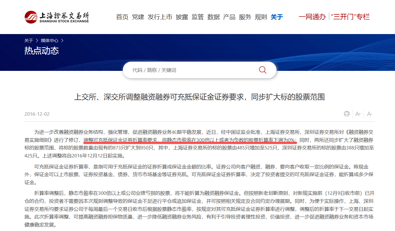 2016年12月2日,沪深两地交易所公告称,经证监会批准,近日沪深交易所对《融资融券交易实施细则》进行修订,其中,调整可充抵保证金证券折算率要求,将静态市盈率在300倍以上或者为负数的股票折算率下调为0%。