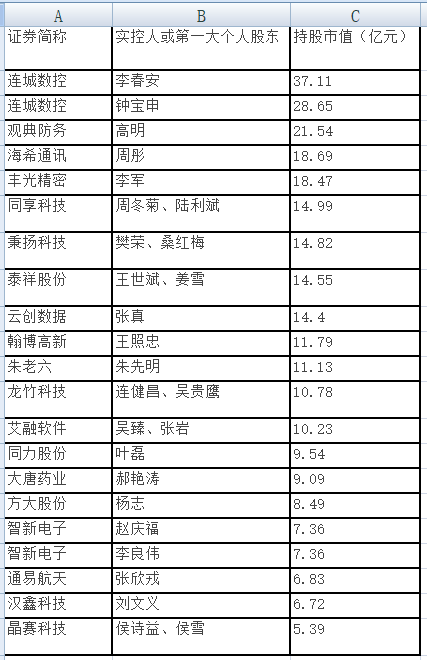 北交所首批挂牌企业普遍市值不高,导致其造富效应并不明显。但部分龙头企业市值领先明显,仍有望辅助首批挂牌企业创始人身家提升至百亿以上。其中最为引人瞩目的是连城数控创始人钟宝申、李春安。连城数控第一大股东沈阳汇智投资有限公司,持有连城数控30.58%股权,钟宝申和李春安则分别持股汇智投资33.1%、27.64%;此外,李春安还直接持股连城数控4.66%。