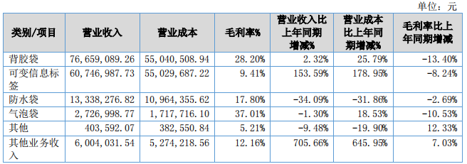 方大股份产品主要包括背胶袋、可变信息标签、防水袋与气泡袋等快递包装产品,公司是全球主要的背胶袋厂家,是国内快递包装行业龙头。其中背胶袋和可变信息标签是公司收入支柱,背胶袋收入约占公司总收入的50%,但随着新生产线的不断投产,可变信息标签的收入快速增长。