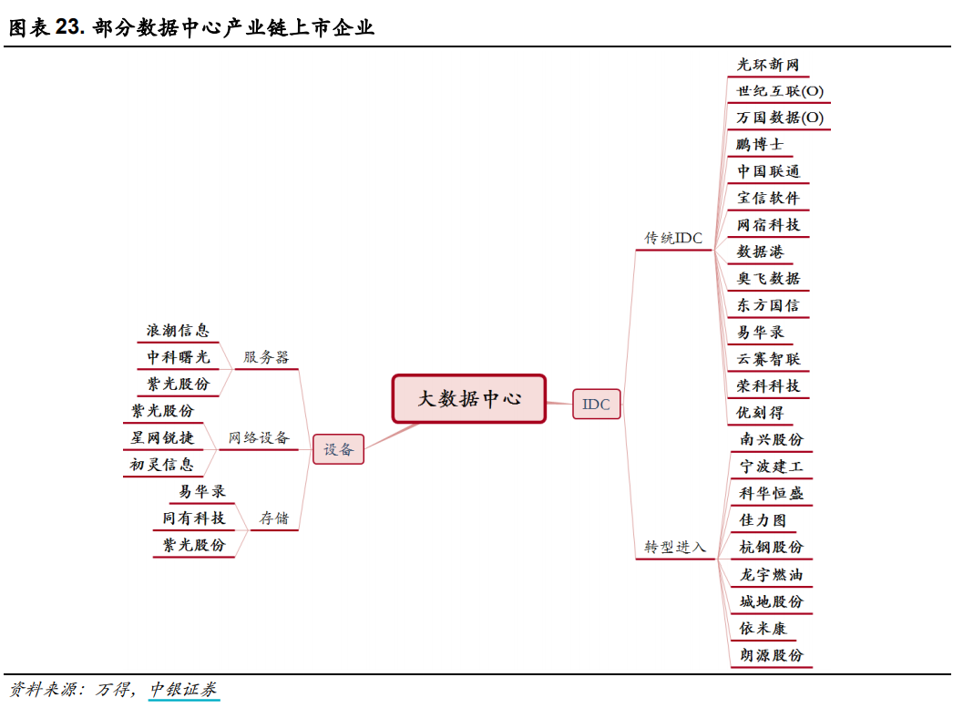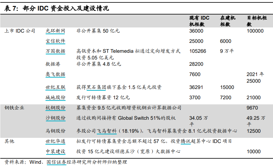 其建议关注专业第三方IDC企业,包括宝信软件、数据港、奥飞数据。同时,IDC带动的产业链上游也将受益,如服务器、网络设备等,推荐浪潮信息、紫光股份,关注中科曙光。