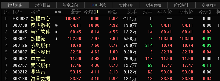 (上海,研究员 吴忧)讯,大盘今日整体表现震荡,板块热点轮动较快。但数据中心板块表现依旧强势,截至收盘,奥飞数据涨停,宝信软件、数据港、杭钢股份均涨超7%,其他个股也表现不俗。