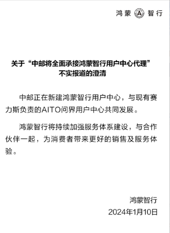 1月10日讯,针对“中邮将全面接管华为汽车业务鸿蒙智行的用户中心代理”的消息,鸿蒙智行发布声明称,中邮正在新建鸿蒙智行用户中心,与现有赛力斯负责的AITO问界用户中心共同发展。