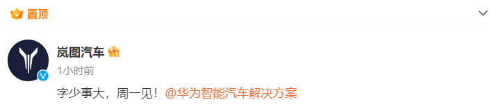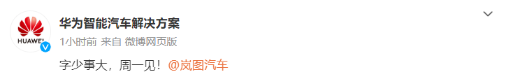 岚图汽车与华为智能汽车解决方案均通过官方微博发布预告,“字少事大,周一见!”