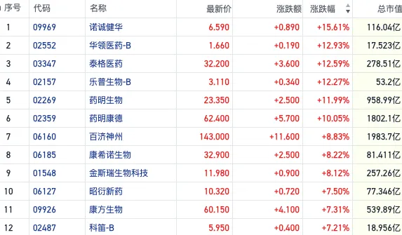 截至收盘,阿里健康(00241.HK)涨超29%,成交近逾57亿港元,平安好医生(01833.HK)涨约18%。此外,药明生物(02269.HK)、药明康德(02359.HK)等生物医药个股跟涨幅度也都达到两位数,短线资金追捧程度可见一斑。