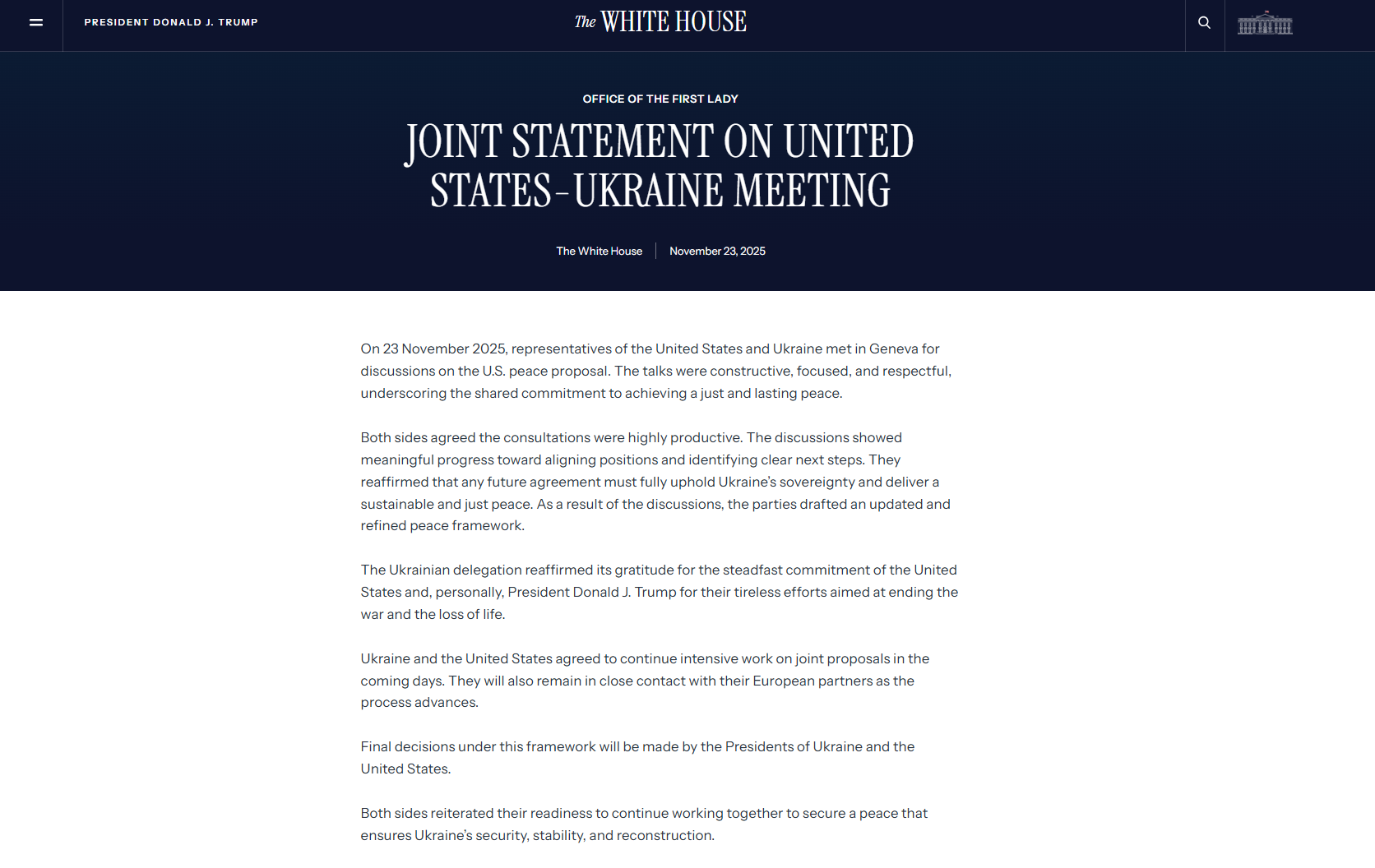 稍后,美国白宫网站刊登一份声明称,美国和乌克兰代表在日内瓦的讨论显示,双方在协调立场和明确后续步骤方面取得了实质性进展。双方重申,任何未来的协议都必须充分维护乌克兰的主权,并实现可持续和公正的和平。会谈结束后,双方起草了一份更新和完善的和平框架。