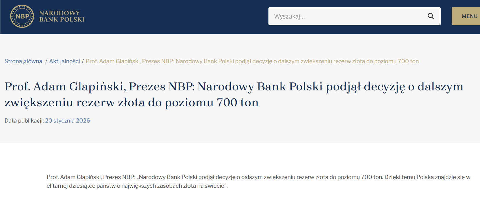 Glapinsk认为,黄金是一种零信用风险的资产,不受其他国家货币政策决定的影响,并且对金融冲击具有较强的抵御能力,高额黄金储备也有助于提升波兰经济的稳定性。
