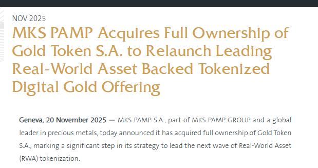 当地时间周四(11月20日),MKS PAMP在官网宣布已完全收购 Gold Token SA,声称此举“标志着公司向着引领下一波现实世界资产(RWA)代币化浪潮的战略迈出了重要一步。”