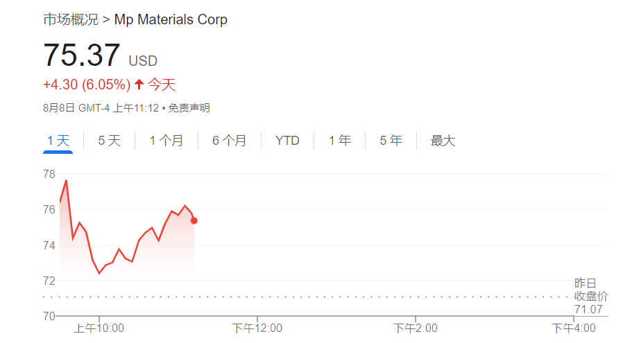 MP Materials股价在早盘交易一度飙升逾10%,逼近80美元关口,最新涨幅收窄至6%。