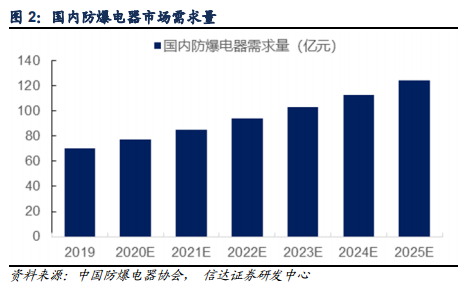 对于安全生产所催化的相关产业链,信达证券分析师罗政建议关注防爆电器。防爆电器是指在含有爆炸性危险气体混合物的场合中能够防止爆炸事故发生的电器,随着我国防爆监管力度的不断趋严,石油、化工等传统行业对防爆的需求稳定增长,医药、白酒、城市管廊等新行业对防爆电器需求快速提升,未来防爆电器市场规模有望保持稳定增长。投资标的方面,推荐国内防爆电器龙头、国内市占率约为 21.9%的华荣股份。