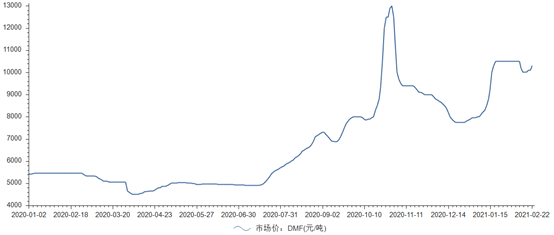Chioce统计数据显示,当前DMF的市场均价为10,300元/吨,较去年底的最低价格7800元/吨,上涨幅度超过30%。