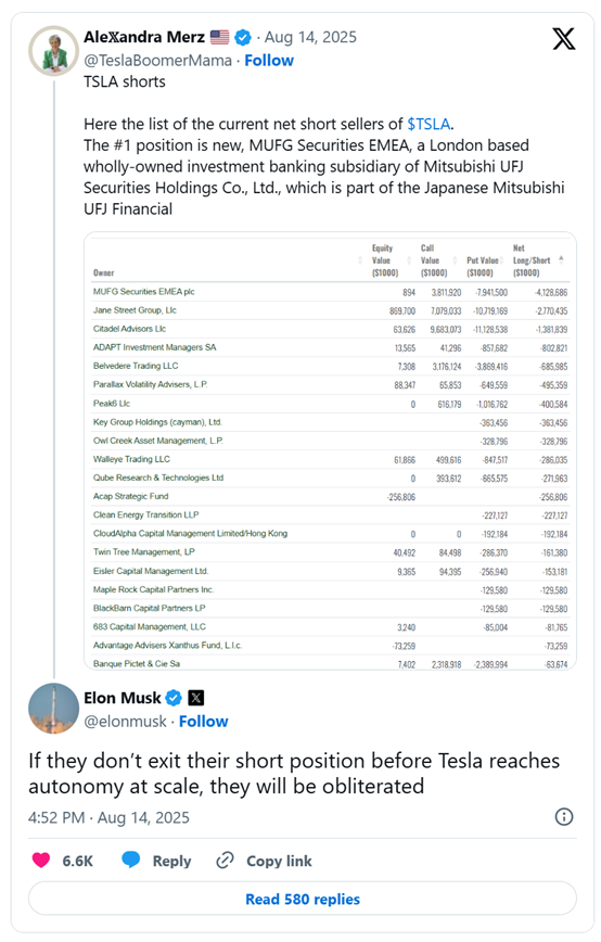 马斯克的最新警告是对特斯拉散户投资者Alexandra Merz发帖的回应,后者分享了这家电动汽车制造商的卖空者名单。