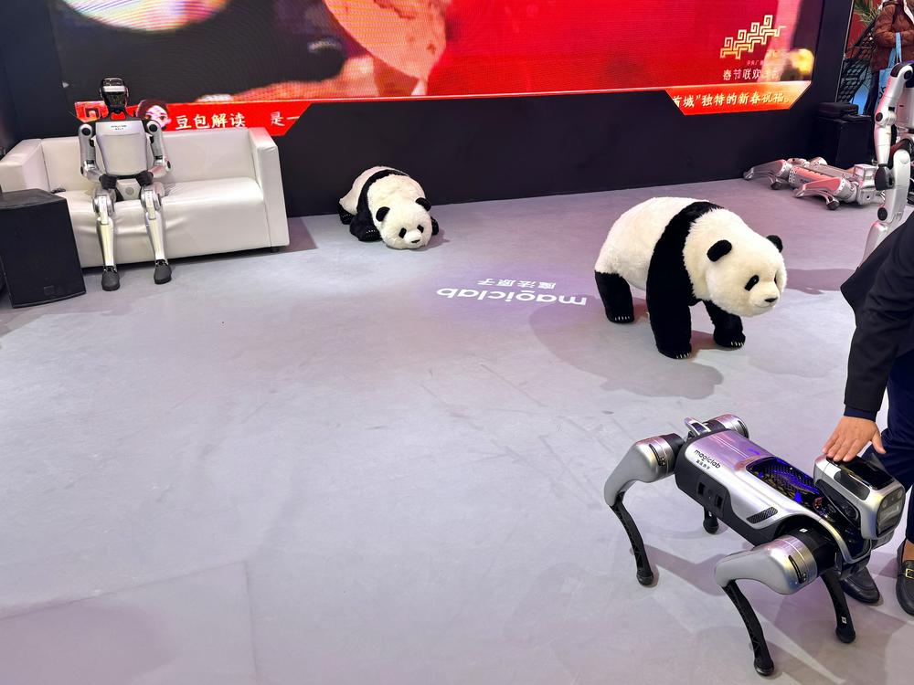 其中,身披熊猫外壳的MagicDog迅速成为展台焦点,毛茸茸的造型吸引大量观众驻足互动。据工作人员介绍,这款“机器萌宠”融合了音、视、触多模态交互,能够通过头尾联动设计实现情感化陪伴。