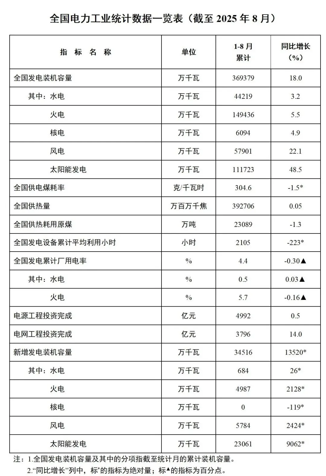9月26日讯,国家能源局9月26日发布1-8月份全国电力工业统计数据。