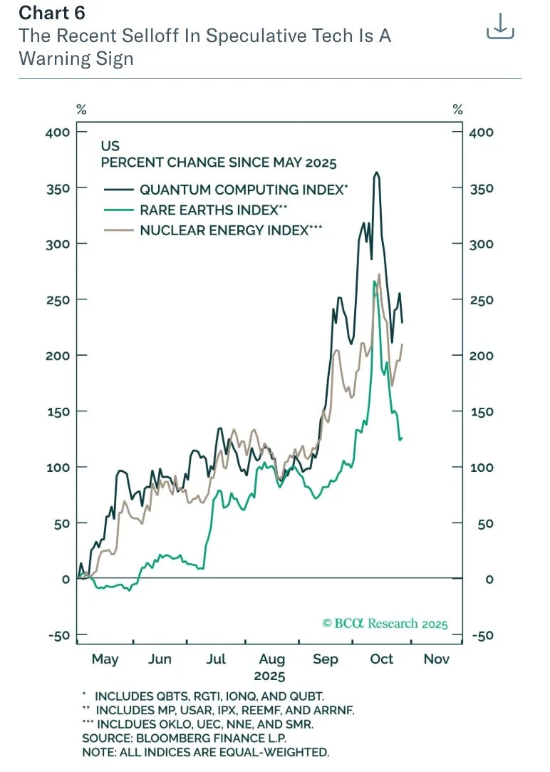 其次,受人工智能交易提振的投机性股票在最近几周遭到抛售。Berezin补充说,这是人工智能行业的另一个令人担忧的迹象,他指出,量子计算、稀土和核能股最近出现了下跌。
