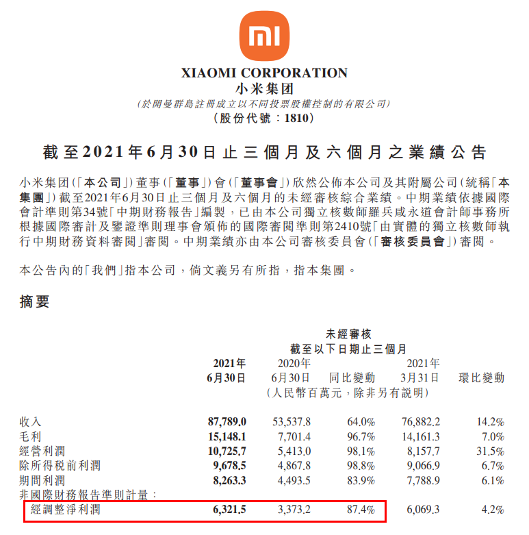 小米集团:第二季度经调整净利润达63亿元 同比增长87.4%