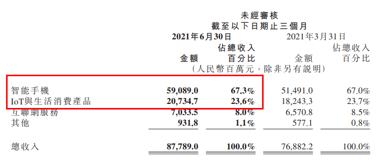 2021年第二季度,我们的IoT与生活消费产品业务继续表现强劲,收入实现人民币207亿元,同比增长35.9%。主要是由于空调、笔记本电脑及智能手环等若干IoT产品需求增长。