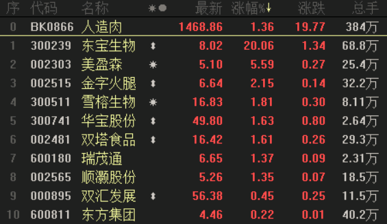 《科创板日报》(上海,研究员 何律衡)讯,本周二(8日),A股人造肉概念午后大涨,其中东宝生物临近收盘直线拉升涨停,美盈森、金字火腿、雪榕生物、华宝股份、双塔食品等涨幅居前。