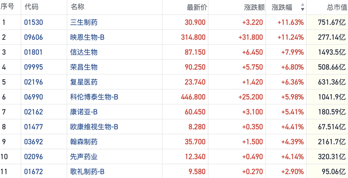 截至发稿,三生制药(01530.HK)、映恩生物-B(09606.HK)均涨超11%,信达生物(01801.HK)涨约9%,荣昌生物(09995.HK)等多只个股也跟涨4%以上。