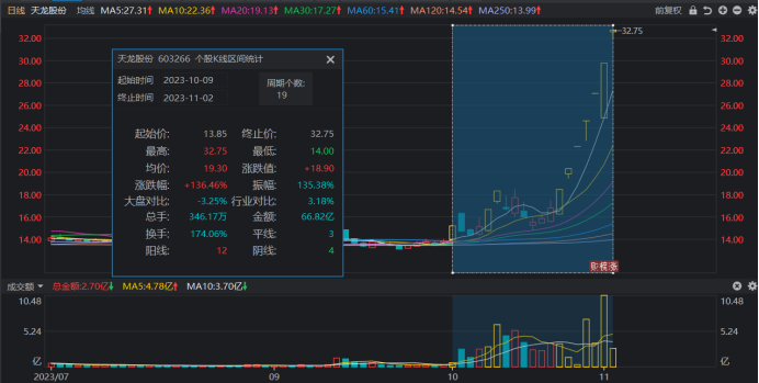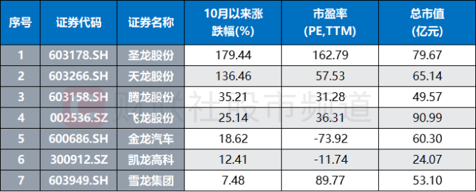 在众多大涨的“龙字辈”股中,天龙股份以7连板的高度位列目前市场高标,其股价也刷新历史新高。据悉,自10月9日以来,天龙股份持续拉升走强,截至今日收盘,其累计19个交易日内上涨近136%,期间共录得涨停板10次。同样带有“龙”字的圣龙股份也于10月期间一度上演连板行情,其自9月28日至10月25日内连续涨停,以14连板的高度刷新年内连板记录(除ST股外)。
