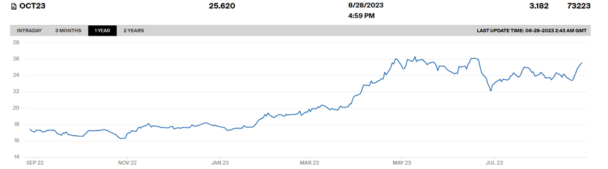 周一,纽约洲际交易所最活跃的原糖合约连续第四天上涨至25.46美分,涨幅为2.7%。