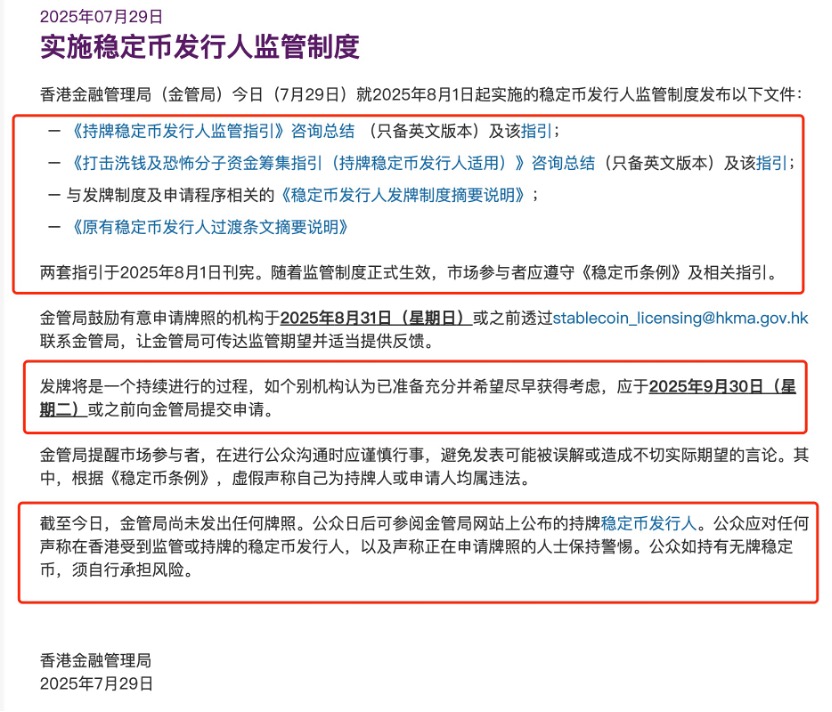 7月30日讯(记者 闫军)香港《稳定币条例》将于8月1日实施,香港金管局在7月29日下午披露了稳定币牌照监管制度,并发布一系列配套文件。